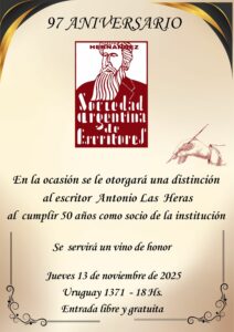 Distinción al escritor Antonio Las Heras al cumplir 50 años de miembro activo de la Sociedad Argentina de Escritores (SADE) Compartir en: Haz clic para compartir en Facebook (Se abre en una ventana nueva) Facebook Haz clic para compartir en X (Se abre en una ventana nueva) X Haz clic para compartir en LinkedIn (Se abre en una ventana nueva) LinkedIn Haz clic para imprimir (Se abre en una ventana nueva) Imprimir